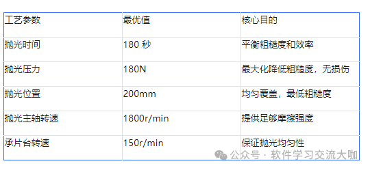 结合实验数据和量产效率,文档得出干式抛光的 “黄金参数组合”,适配直径 300mm、厚度 200μm 的硅晶圆,其他尺寸可参考调整: