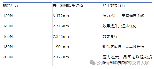 压力不可盲目加大:超过 180N 后,晶圆破损率飙升,粗糙度反而上升;
