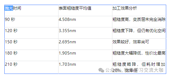 时间无需过度延长:180 秒后粗糙度下降幅度不足 10%,但耗时增加 20%,降低产能;