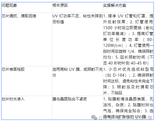 文档重点测试了主流的 D-184 型低粘性 UV 膜(芯片尺寸 < 1mm 首选),结合案例总结了实操中最容易遇到的问题和解决方案,避免大家踩坑: