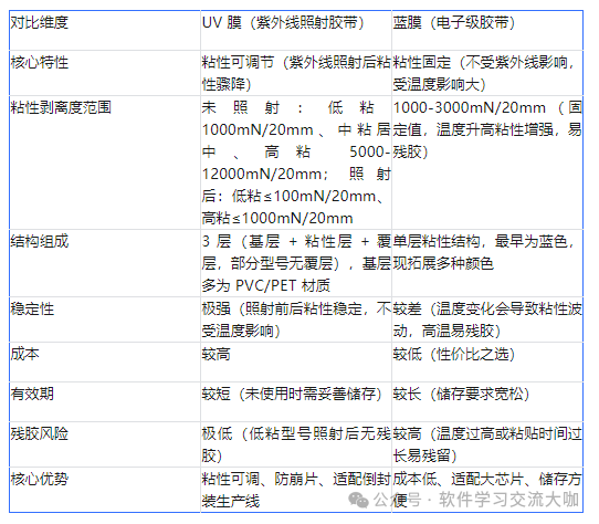 UV 膜和蓝膜虽然都能实现固定保护,但特性差异极大,选错的核心后果就是:小芯片用蓝膜→崩片;大芯片用 UV 膜→成本翻倍。下面从 8 个关键维度做详细对比,看完再也不踩坑: