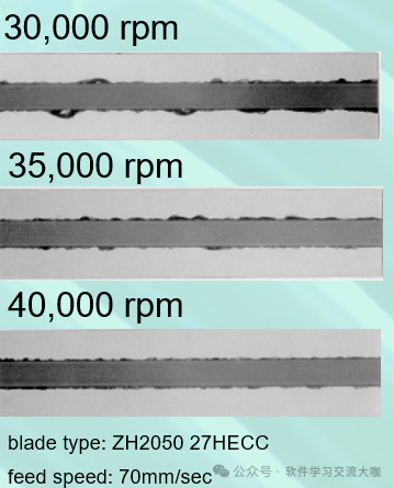 规律:转速越高,切割越平整,但需匹配刀片强度(ZH05 刀片可承受更高转速,减少蛇行);
