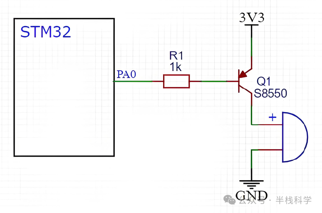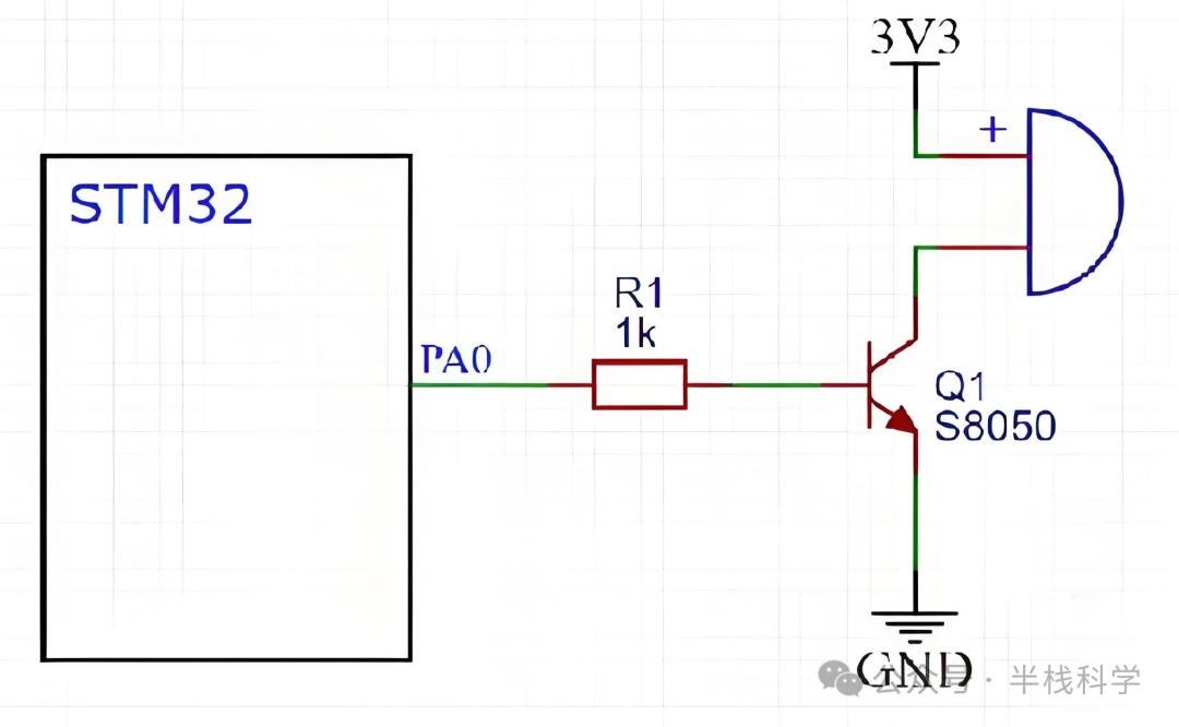 控制的大电流从集电极c流向发射极(e)使得蜂鸣器之间电路导通。