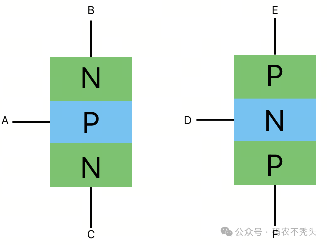 晶体管又称半导体三极管,从结构上来看,就是在二极管的基础上,增加了一极,多出的一极可以是P,也可以是N,因此,又把晶体管分为PNP晶体管和NPN晶体管,如下图所示以NPN晶体管为例,讲述电子开关的原理,向A端施加正向电压,向B端施加负向电压,晶体管经AB端导通,同理,经AC端导通。当然晶体管还可以用作信号放大器,将微弱的信号放大,对晶体管信号放大原理感兴趣的,请评论区留言。