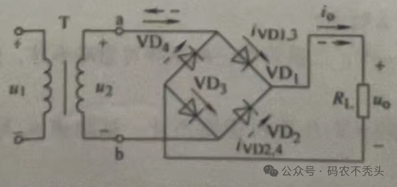 半导体二极管是由PN结两端接上电机引线并用管壳封装构成的。由P区引出的电极称为阳极,N区引出的电极称为阴极。由于PN结的单向导通性,二极管导通时电流方向是从阳极流向阴极。二极管广泛用于稳压、整流、制造LED等领域。例如在整流方面,用4个二极管,巧妙的将交流电整流为直流电,原理如下图所示,通过变压器T的正半段电流,由a点经二极管VD1、元器件R、VD3到b点构成正半段回路,变压器T的负半段电流,由b点经二极管VD2、元器件R、VD4到a点构成负半段回路,就实现了将交流电转为直流电,我们手机电脑使用的都是直流电。