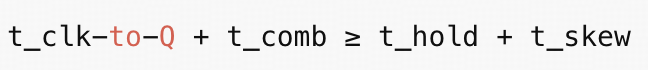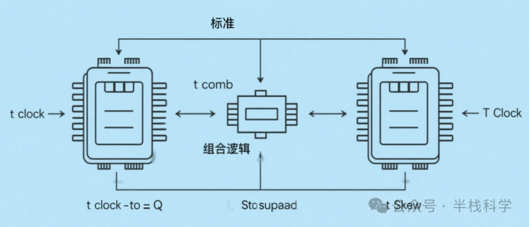 t_clk-to-Q:时钟触发器输出数据的延迟t_comb:组合逻辑的传播延迟t_setup:接收触发器的建立时间t_hold:接收触发器的保持时间t_skew:同一时钟在不同触发器之间传播的相对延迟(即时钟偏移)
