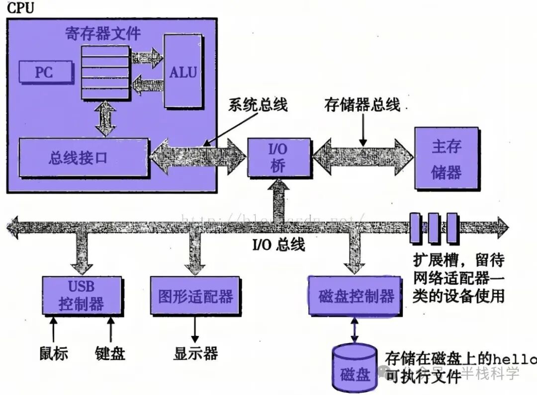 但是计算机的CPU没办法直接跟磁盘交互,它只跟内存打交道。CPU通过总线读写内存的数据,如果数据不在内存中,就会去磁盘中检索对应的数据到内存中,