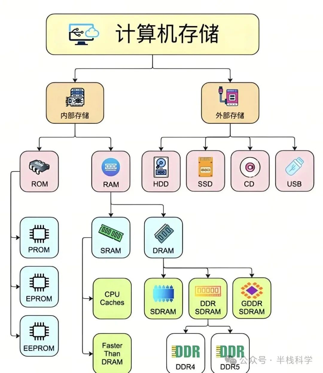 静态随机存取存储器(SRAM):使用双稳态触发器(通常由6个晶体管组成)来存储每个位的数据。SRAM速度快,但成本高,主要用于缓存(Cache)等对速度要求高的场合。