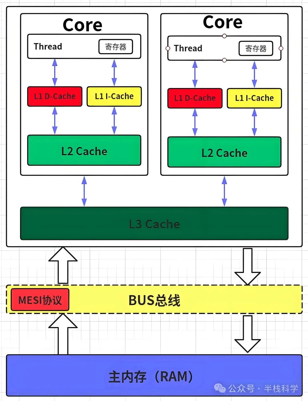不用被内存读写速度慢拖累。但它不好的地方是,这种三级缓存结构,在数据同步方面比较麻烦。特别是多核处理器,在修改缓存数据之后,