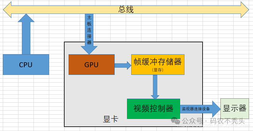 如图所示,图像或者视频数据一旦离开CPU,必须通过4个步骤,才会到达显示器: