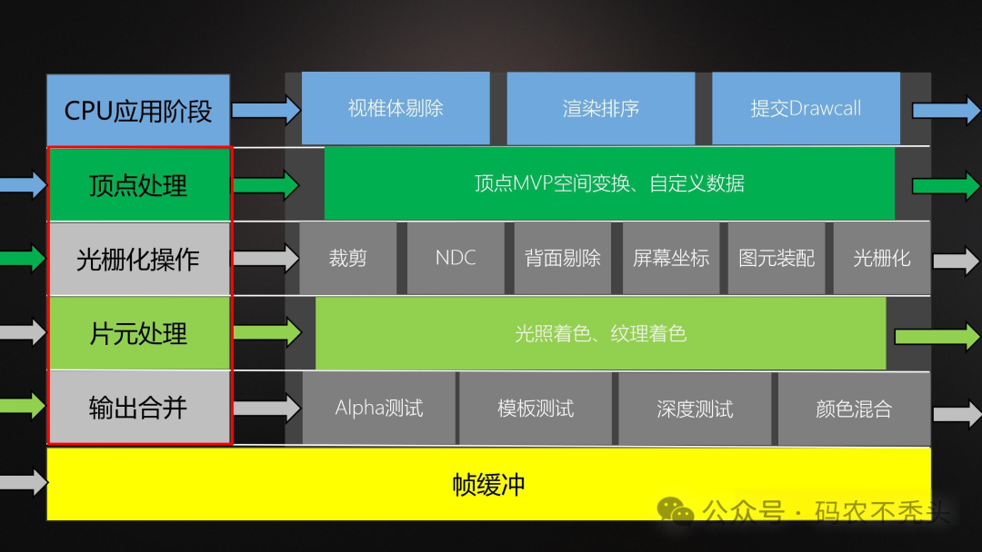 渲染流水线就像一条像素工厂的自动化流水线,每个阶段并行处理不同的数据,效率极高。