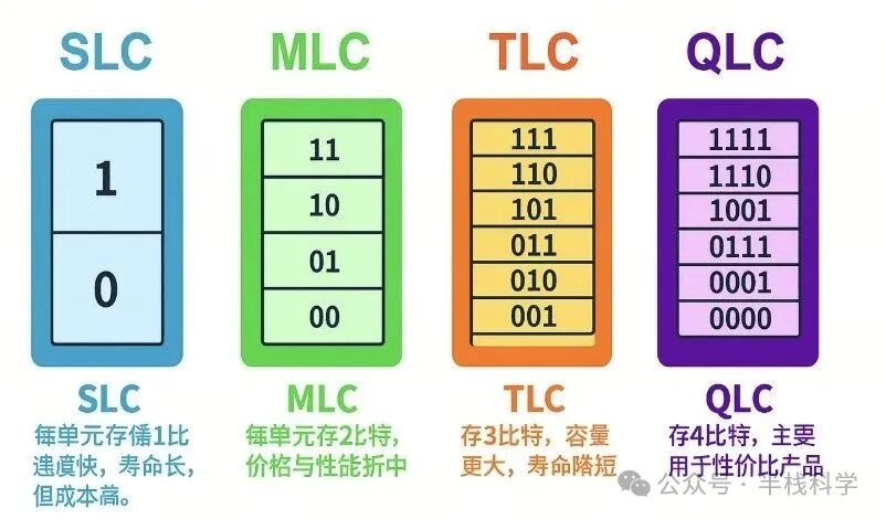 SLC(Single-Level Cell):每个单元存储1比特,速度快,寿命长,但成本高。