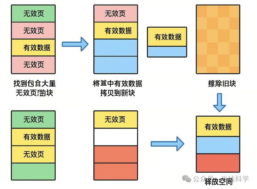 为了避免写放大对性能的影响,SSD会在后台自动进行“垃圾回收”——把有效数据从旧块复制出来,把无效数据擦除,腾出空间供写入。