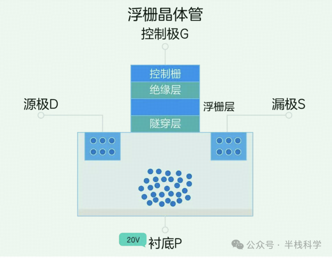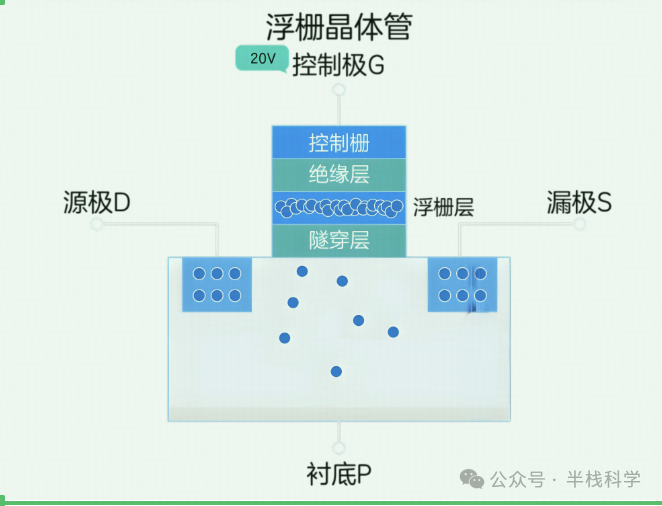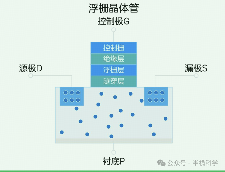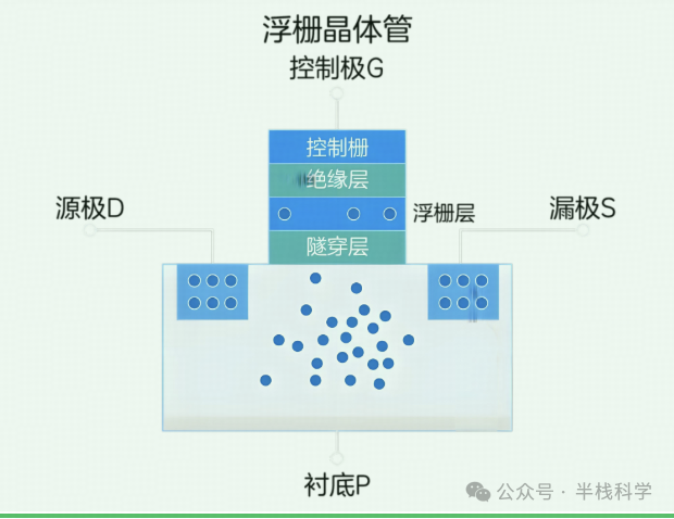 浮栅晶体管由存储电子的浮栅层、控制极G、衬底P、源极D与漏极S组成,如下图