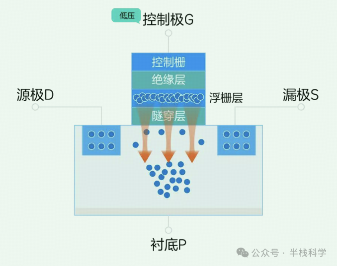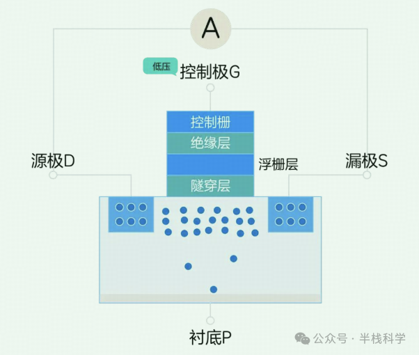 当浮栅层中存在电子时(存储数据为0),我们还给控制极一个低压,由于浮栅层里面的电子对这些电子有排斥作用,所以电子无法被吸引到靠近隧穿层的位置,
