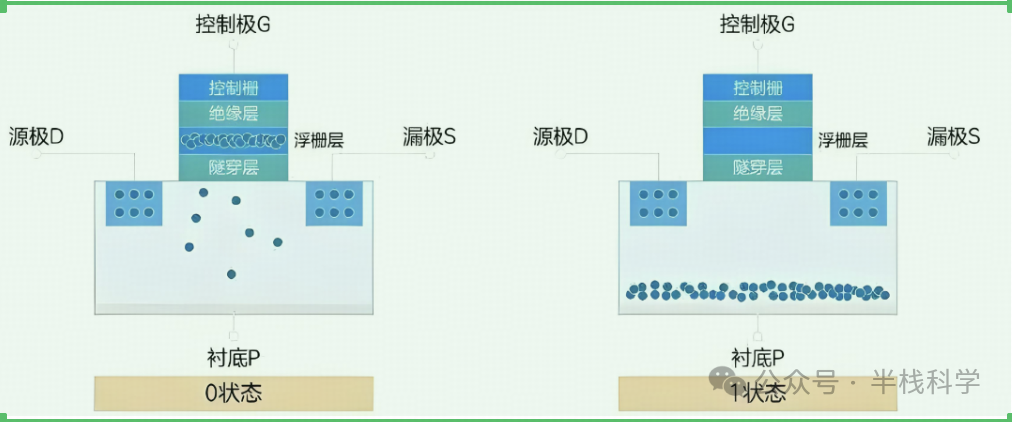 而当我们把电压撤去,这些电子依然会被囚禁在浮栅层,因为隧穿层本质上也相当于绝缘体,所以电子们只能被关押着,这样一位数据就被存储进去了。