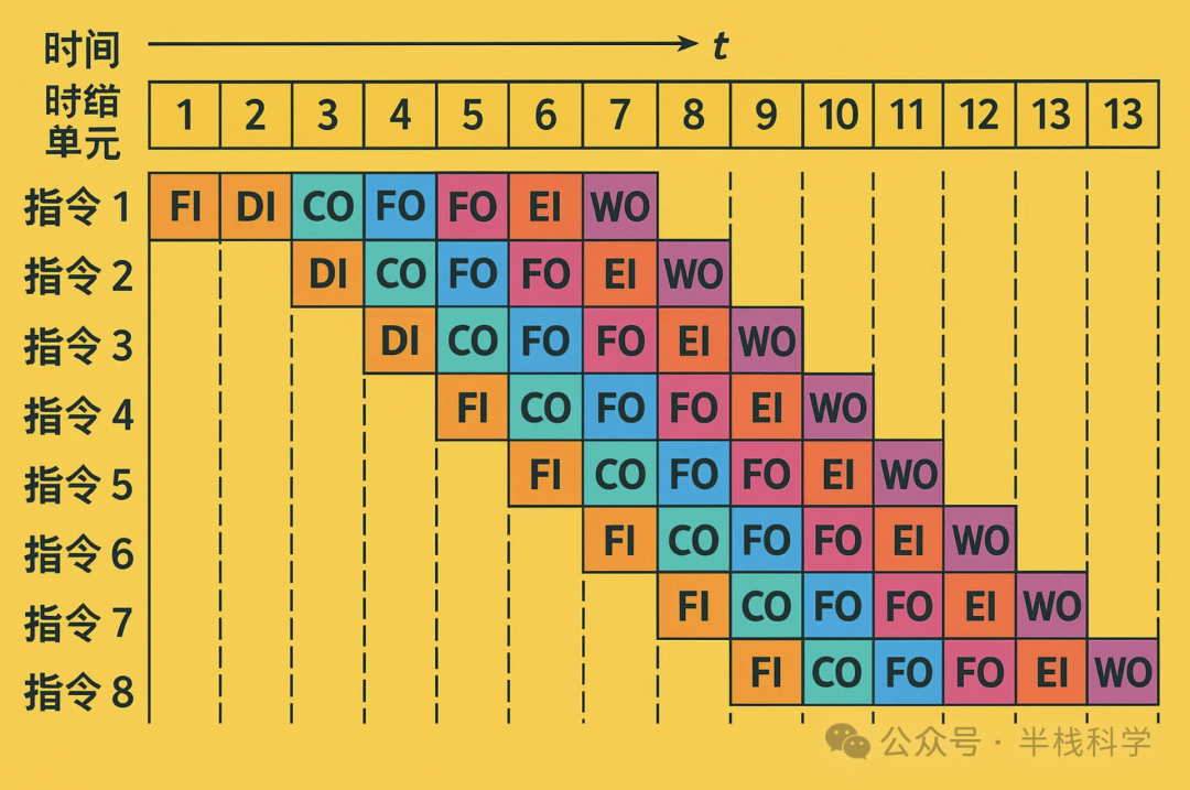 如果采用流水线,则可以在时间上将不同指令的执行 ”重叠“ 起来,实现并行的效果: