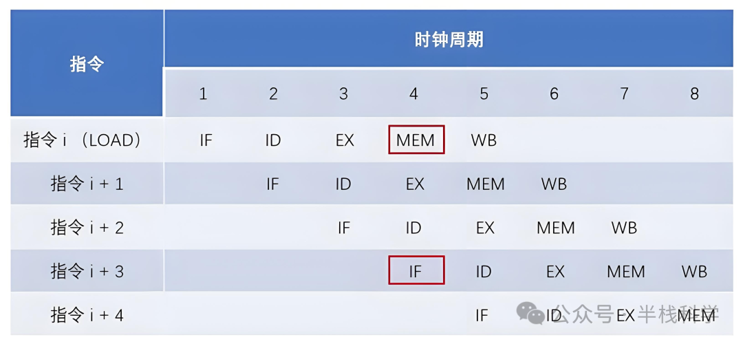 那么如果在某个时钟周期内,流水线上某一条指令处在 IF 阶段、另一条指令处在 MEM 阶段,就会发生访存冲突。