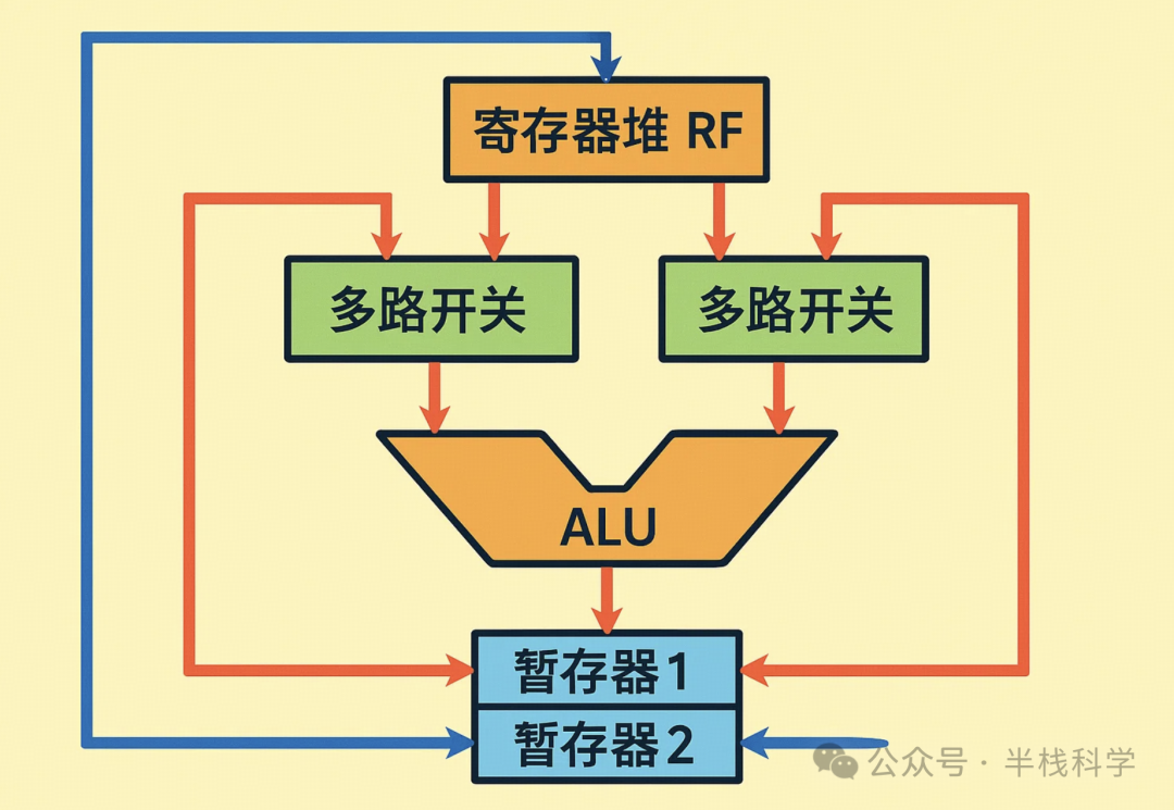经多路开关直接送回 ALU 参与后续的计算。这里的定向传送,只发生在 ALU 内部。