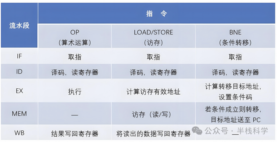 指令译码/读寄存器(ID)、执行/计算有效地址(EX)、访存(MEM)、结果写回寄存器(WB)。那么不同类型的指令,在各流水段的操作也有所不同: