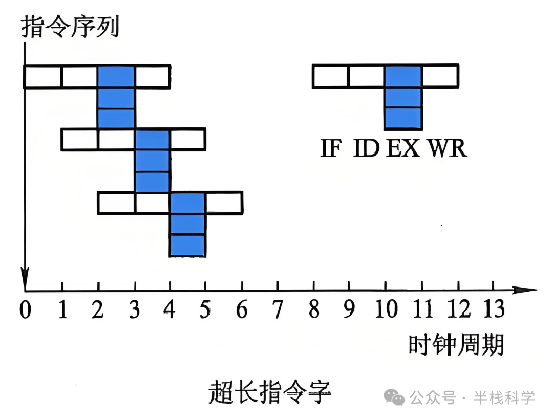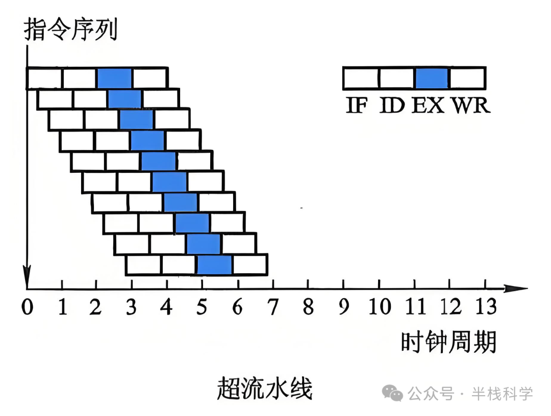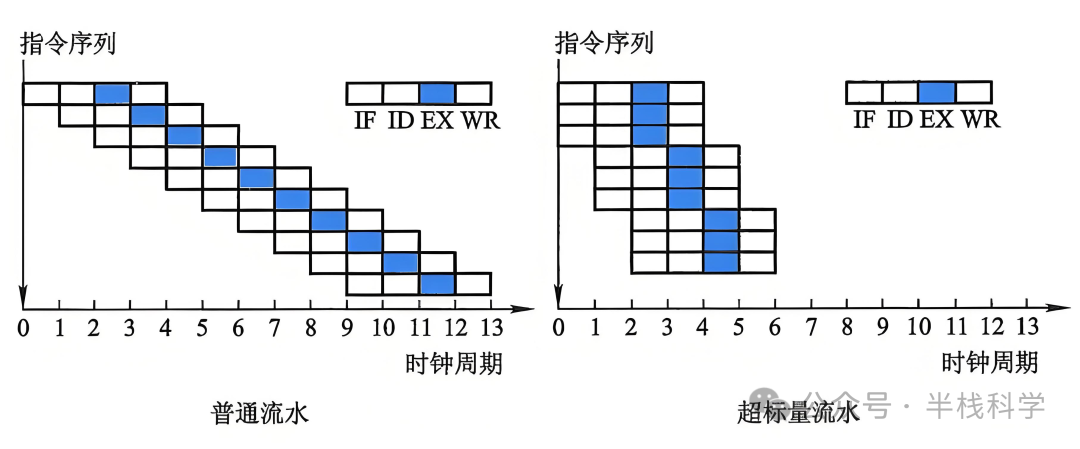 上图是普通流水线和超标量流水线的对比。这里是一条四级流水线,处理一条指令分为 4 个阶段:取指(IF)、译码(ID)、执行(EX)和 写回(WR)。
