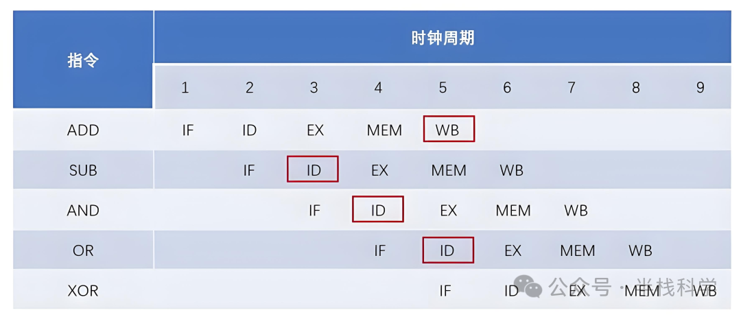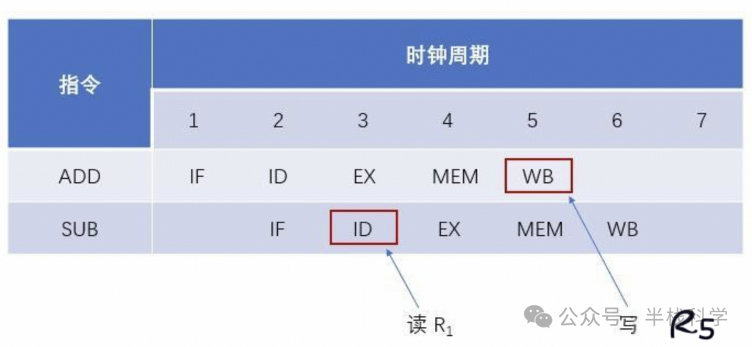 在第 3 个时钟周期,SUB 指令就开进入指令译码、读取寄存器 R1的数据了;而要到第 5 个时钟周期,ADD 指令才会将真正的计算结果写回。