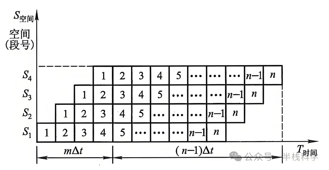 而各段真正处于工作的时空区域为:m · n · Δt。
