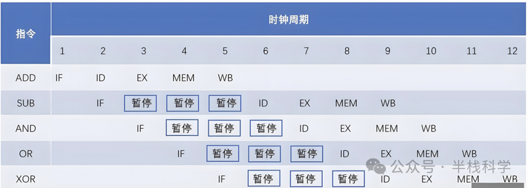 如果采用后推法,将后续指令延迟到 ADD 指令完成写回 WB 阶段之后,就可以解决数据冒险: