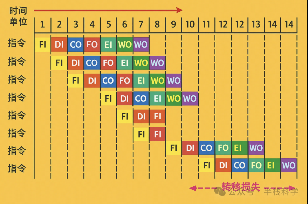 当遇到条件转移指令时,下一条指令是无法提前确定的,只能根据前一条指令的执行结果来判断,时间上会有损失。