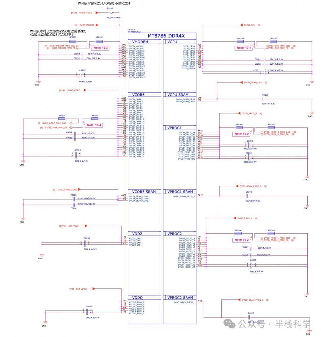 DVDD_CORE: 主要供给核心电路使用,通过多个去耦电容(如C0252, C0231, C0232等)进行滤波。 DVDD_MODEM和DVDD_GPU: 分别供给Modem和GPU模块,同样通过去耦电容进行滤波。 VDDCORE: 供给核心电压,使用多个去耦电容(如C0201, C0233等)进行滤波。 VDDR和VDDIO: 供给DDR和I/O电路,通过去耦电容进行滤波。 VPROC: 供给处理模块,通过去耦电容和电阻进行滤波和稳定。