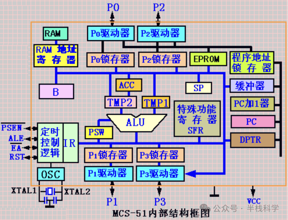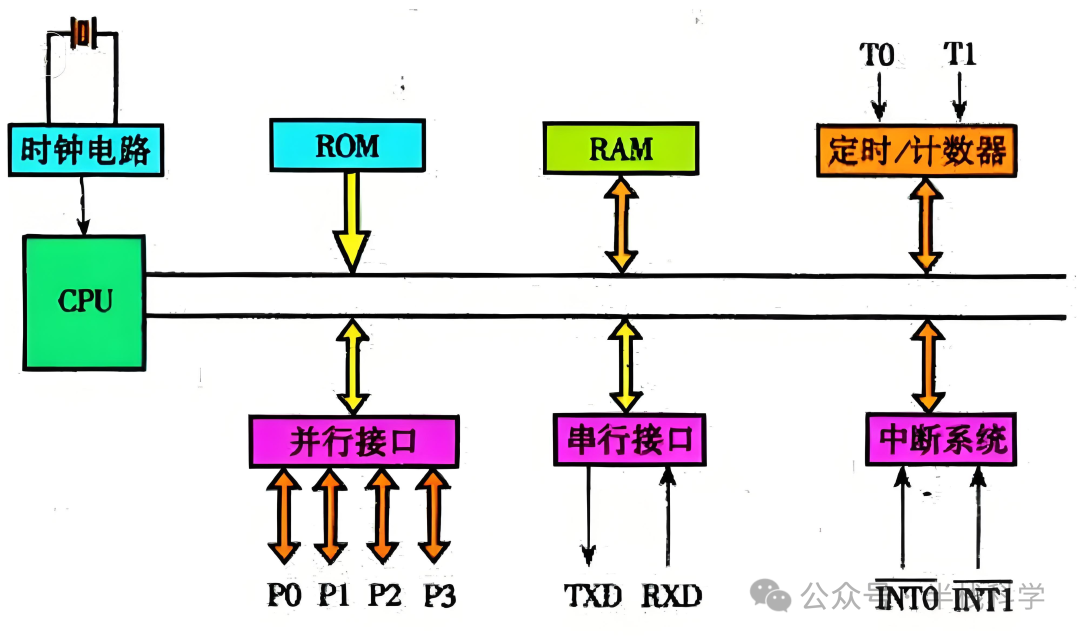 单片机内部通过内部总线将各个模块连接在一起,虽然本质结构仍基于“通用CPU + 外围芯片”的理念,但在控制方式上做了较大优化。