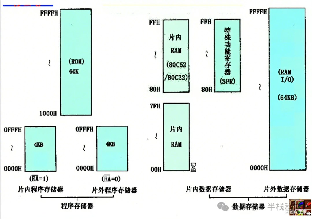 注意:8051 的程序存储器在 0x0000~0x0FFF(即 4KB)范围内可选择为片内或片外。地址高于 0x0FFF 的部分固定为片外 ROM。