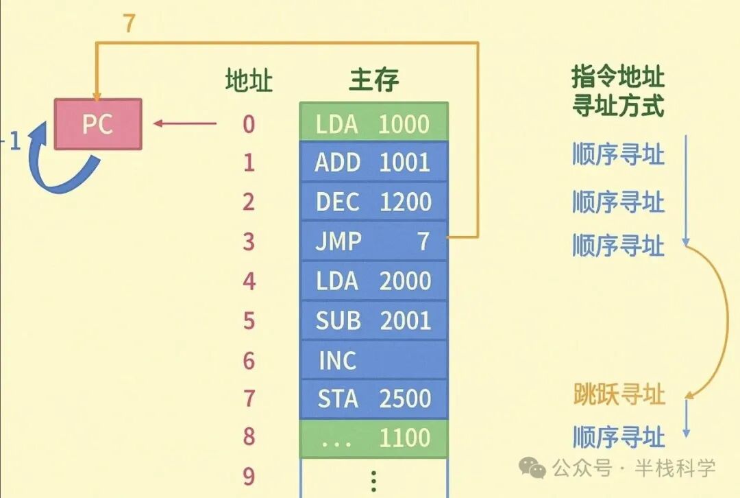 顺序寻址:可通过程序计数器(PC)加1,自动形成下一条指令的地址。