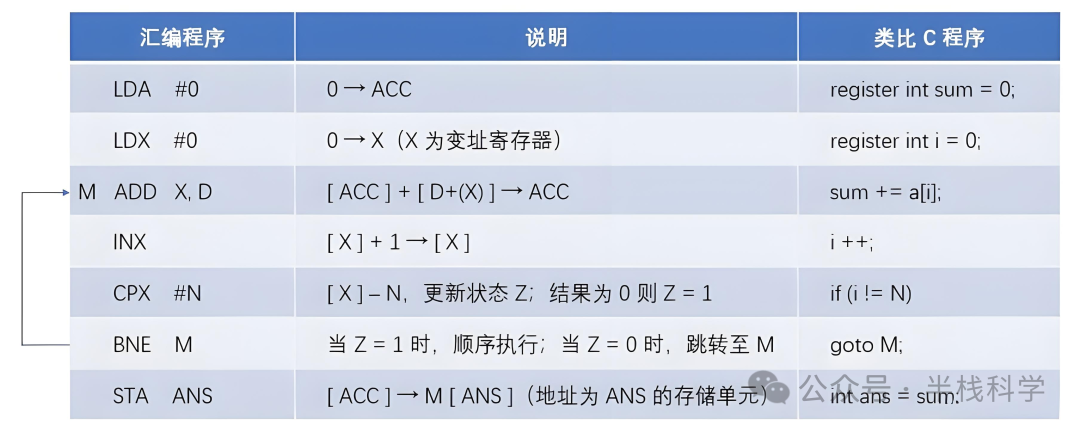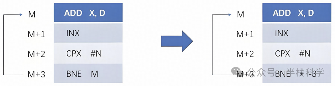 利用一个条件转移指令(BNE),当变址寄存器 X 中内容还没有增大到 N 时,就跳转回 M 处再次执行相同的指令;当增大到 N 时就结束,得到最后结果。