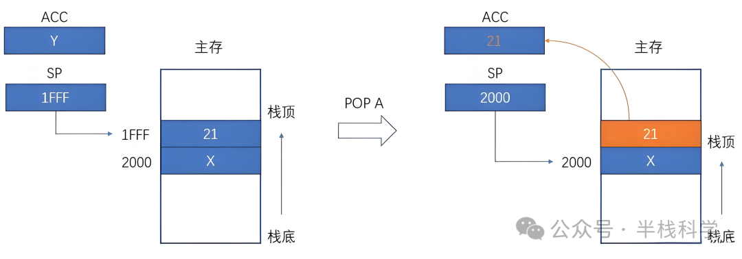 出栈(POP A): (M [ (SP) ])→ ACC;(SP)+ 1 → SP