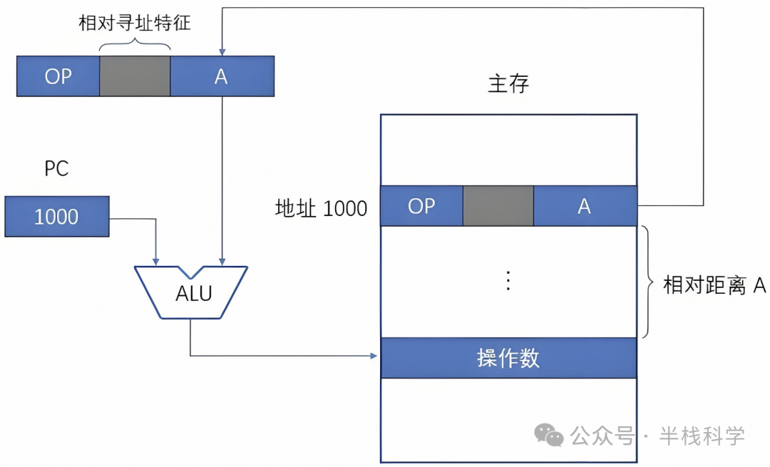 相对寻址也是偏移寻址的一种,它所基于的是程序计数器PC 。将 PC 的内容加上指令中的形式地址,就形成操作数的有效地址,即 EA=(PC)+A