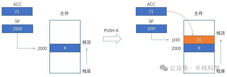 进栈(PUSH A):(SP)- 1 → SP;(ACC)→ M [ (SP) ]