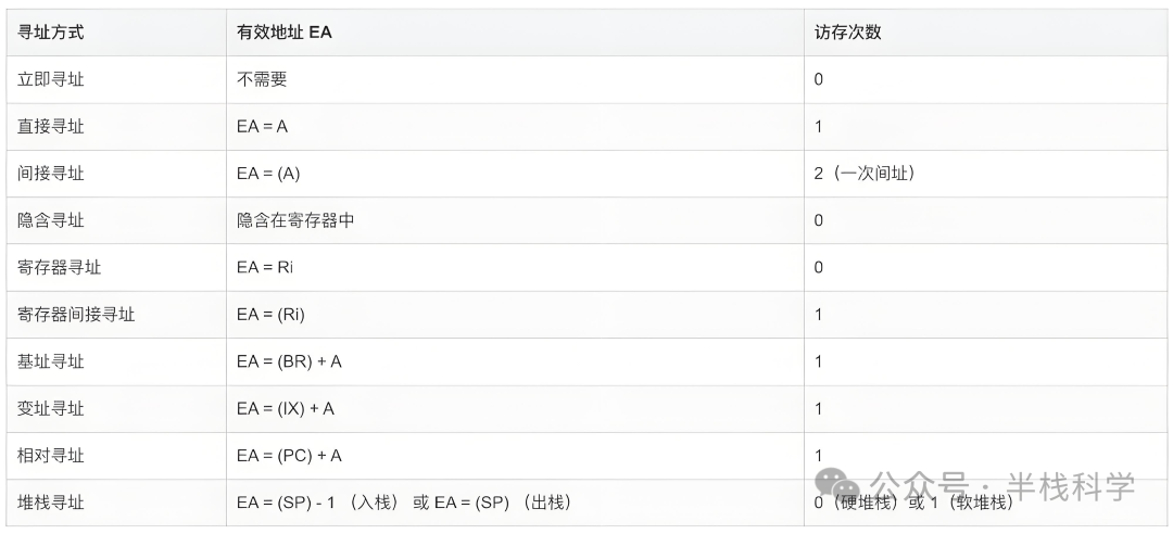 下表列出了所有寻址方式、有效地址及访存次数的简单总结(不含取本条指令的访存)。