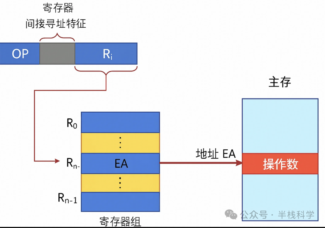 这是寄存器寻址和间接寻址的结合。跟寄存器寻址相比,指令的执行阶段还需要访问主存;跟间接寻址相比,则可以少一次对主存的访问。
