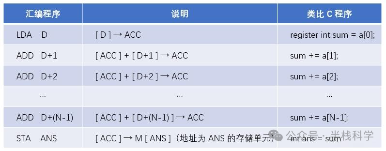 例如,某个数组 a 内有 N 个数据元素,在主存中存放的首地址为 D。那么如果要对数组所有元素求和,可以通过直接寻址的方式依次叠加得到结果,写成汇编语言程序如下: