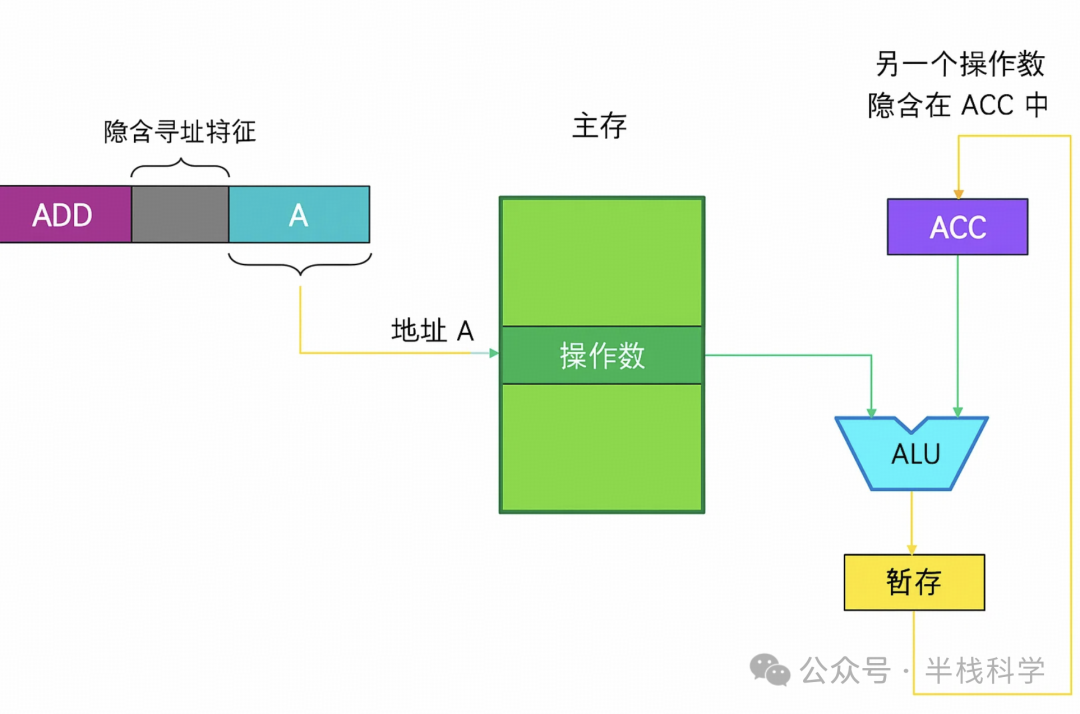 对于加法操作就可以只给出一个操作数的地址,而把另一个操作数放在ACC中;这时 ACC 就是另一个操作数的地址。