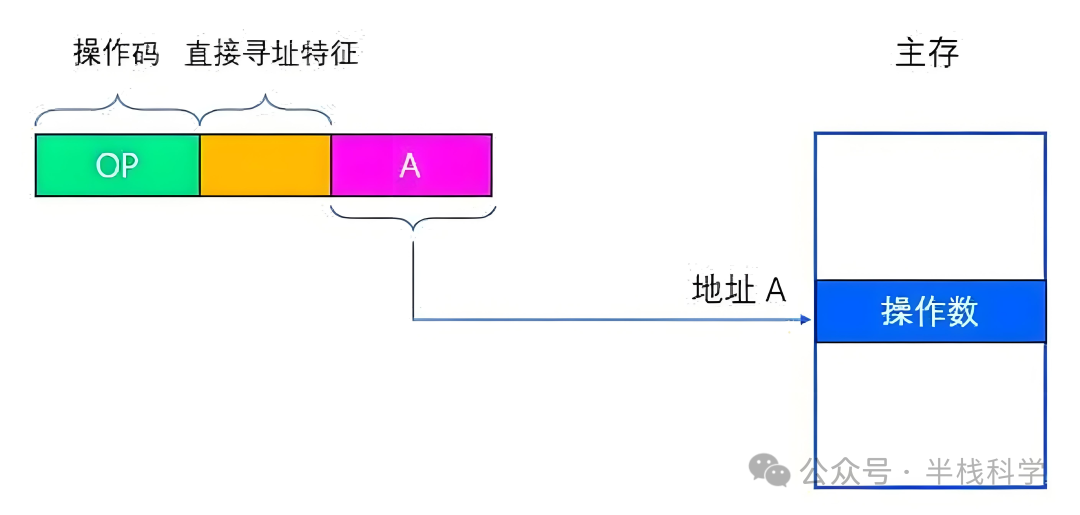 指令格式的地址字段中直接指出操作数在内存中的地址,就称为直接寻址。即 EA=A