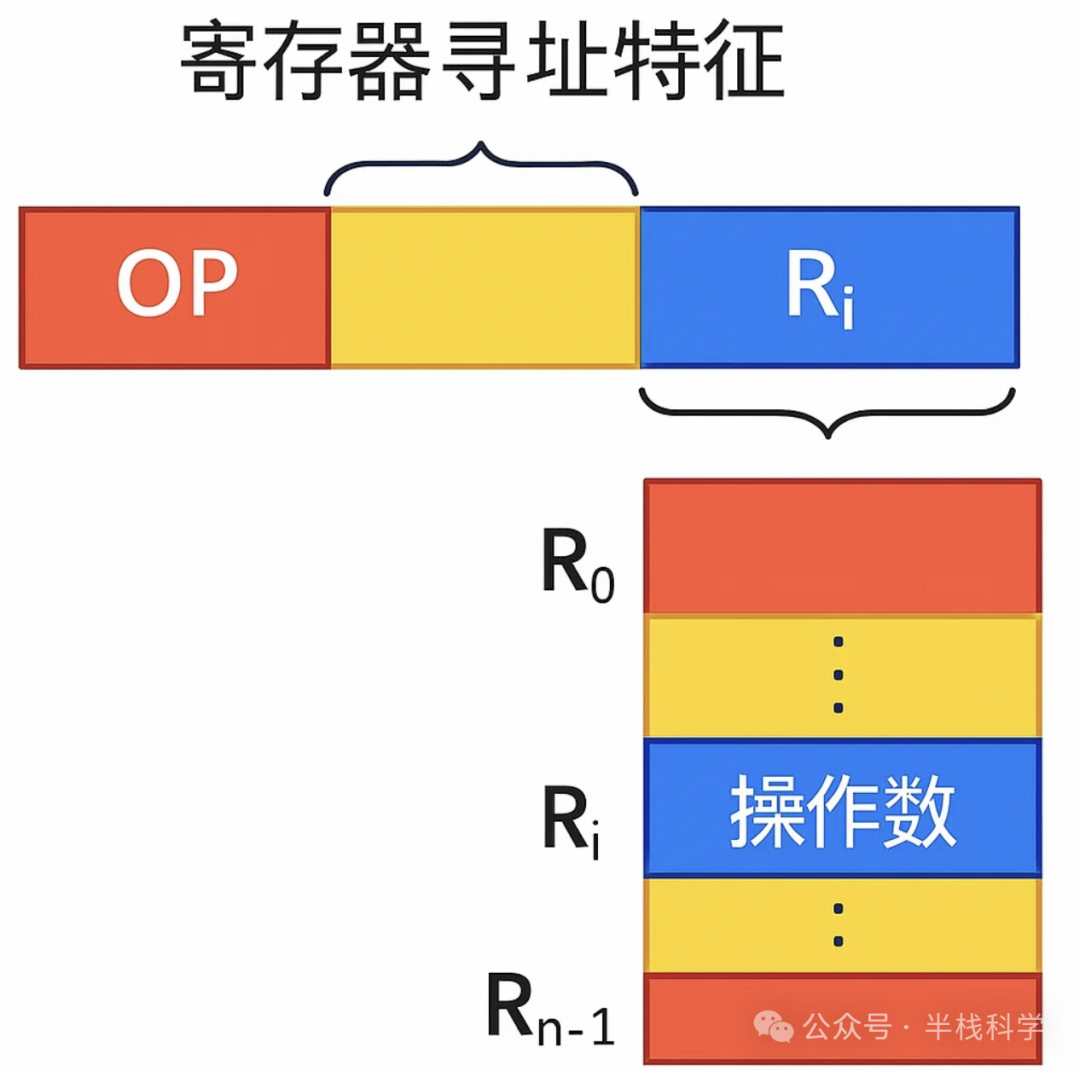 寄存器寻址的指令在执行时所需的操作数来自寄存器,运算结果也写回寄存器;地址码字段直接指出了寄存器的编号,即 EA=Ri