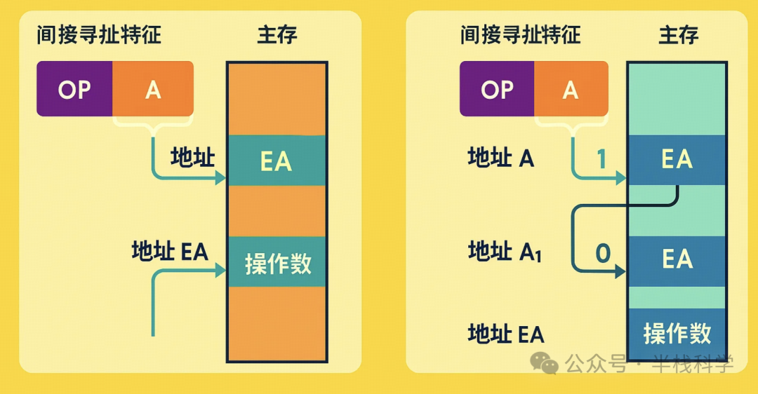 这时可以用存储字的首位来标记间接寻址是否结束:存储字首位为 “1” 时,说明还需要继续寻址;为 “0” 时,寻址结束,当前存储字存放的就是 EA。