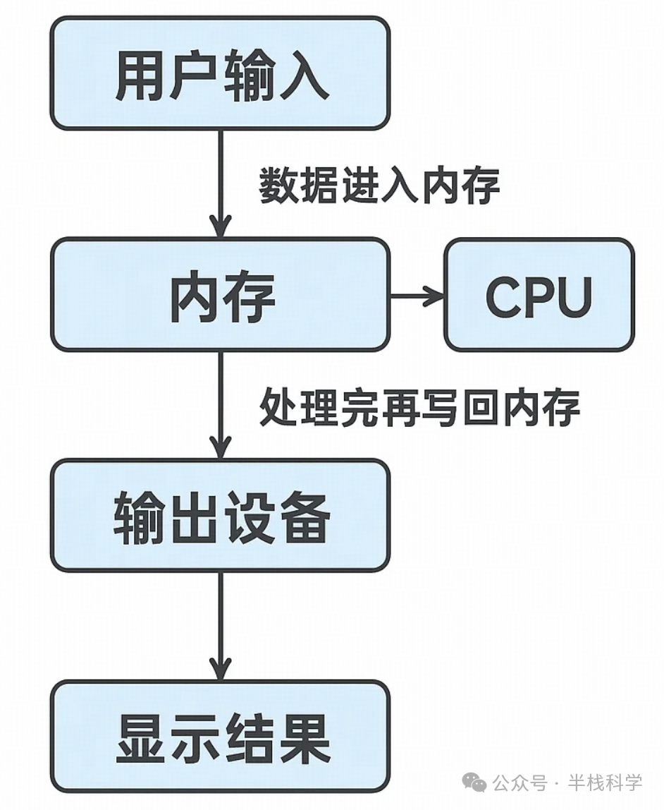 用户输入数据 → 数据进入内存 → CPU从内存读取数据 → 处理完再写回内存 → 内存再传给输出设备 → 显示结果