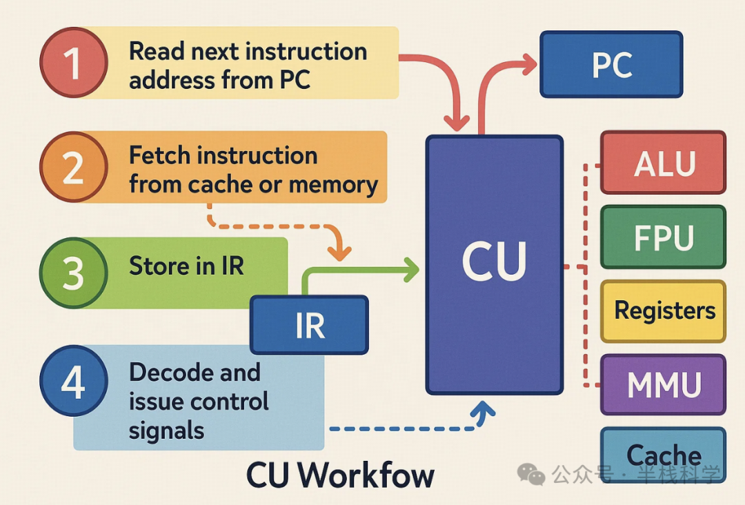 4. 解码后发出控制信号,让 ALU、FPU、寄存器、MMU、缓存等协同工 作。
