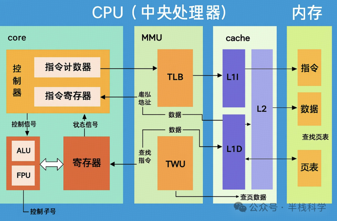上图清晰地展现了CPU(中央处理器)从指令获取、地址翻译到缓存访问、最终读取内存的整个执行流程。下面我将分模块详细讲解这张图的工作原理: