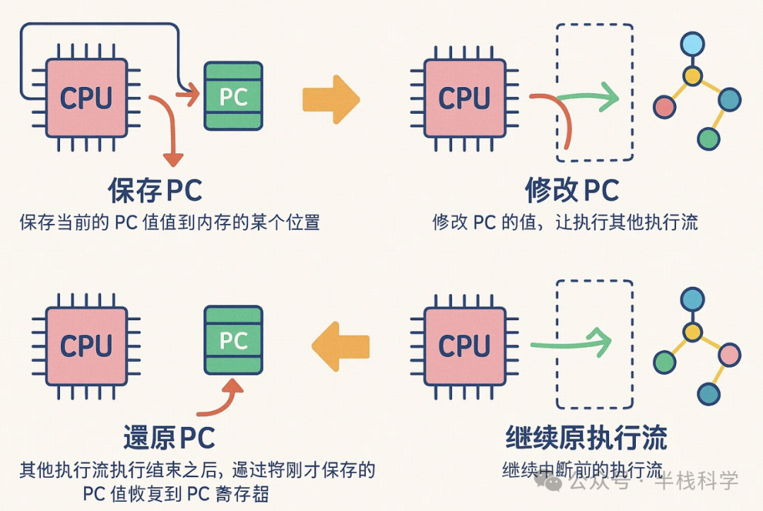 保存PC:保存当前的 PC 的值到内存的某个位置 修改PC:修改 PC 的值,让执行其他执行流 还原PC:其他执行流执行结束之后,通过将刚才保存的 PC 值恢复到 PC 寄存器 继续原执行流:继续中断前的执行流