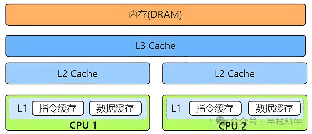 L1:每核心独享,速度最快但最小;
