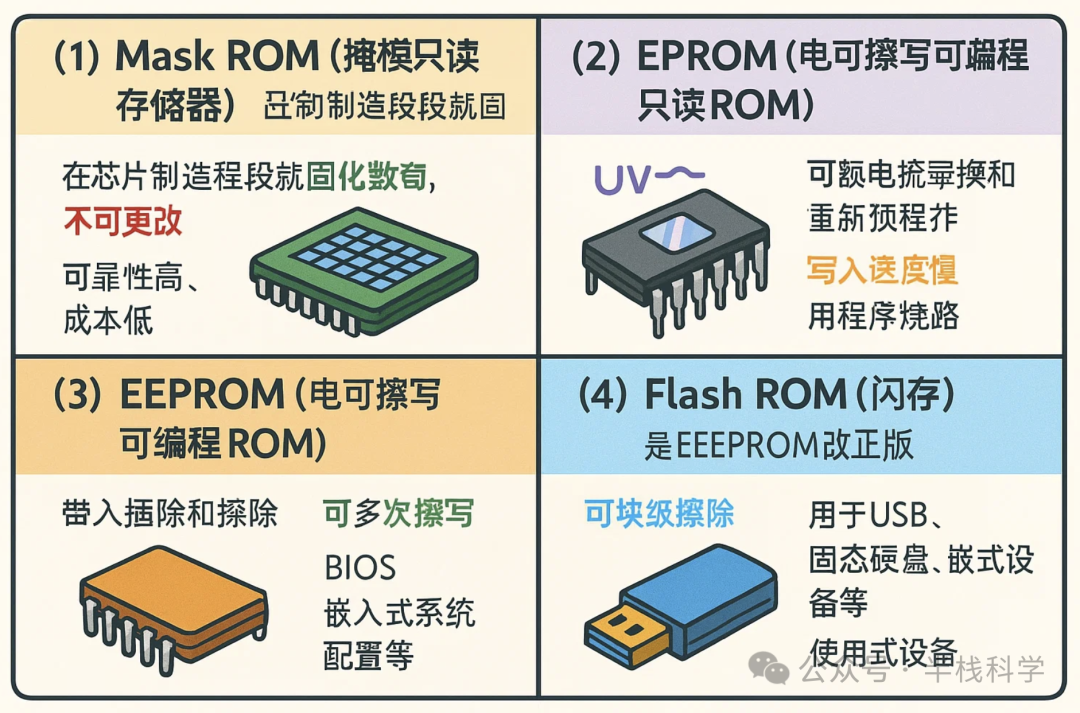 常见形式:Mask ROM、EPROM、EEPROM、Flash ROM等。